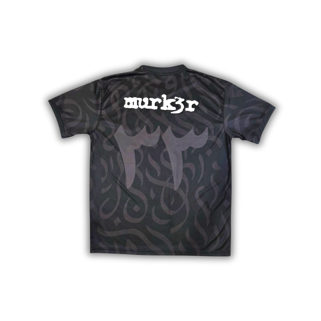 Constructed from lightweight 140GSM 100% polyester interlock fabric with a slightly cropped fit. Features "MURK3R LOGO" and "٣" embroidery patches, Arabic calligraphy background DTG print, and "MURK3R" text screen print on front and back. Size up for a true to size fit.